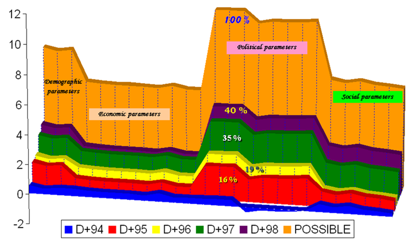 Observers and TA are producing descriptive assessments on a daily and overall efficiency of decision making process on CAX. For proper overview on TA performance, it is advisable to combine these qualitative products with the quantitative measurements of the TA impact on security dimensions of the synthetic crisis area. Multivariate analysis of Local capability for societal reconstruction from the real geographical area (figure 5) could represent initial situation in the synthetic environment. By measuring changes of local potential on main security dimensions (demography, social situation, economy, political situation, environment) CAX analyst could have daily effectiveness of TA decision making process.