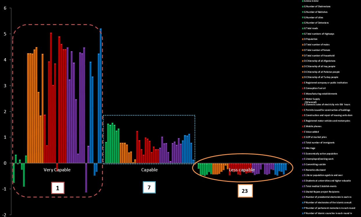 Za izdelavo modela lokalne zmogljivosti provinc, so uporabljene spremenljivke6 , neposredno vplivajo na kakovost življenja in občutek perspektivnosti pri prebivalstvu,Statističnega urada Irana, ki je slednji črpal iz različnih virov političnih institucij Irana. Poleg tega so upoštevani tudi podatki iz Svetovne banke, CIA worldfactbook in ostalih verodostojnih virov mednarodnih organizacij. Večina podatkov je iz obdobja 2012 - 2013. Statistična enota je definirana z nazivom province in številom prebivalstva v njej. Pri analizi so upoštevane naslednje skupine spremenljivk (glej Graf 1): a) geografske (7), b) demografske (8), c) ekonomske (11) , d) socialne (11) in e) politične (6). Pri analizi skupin (glej Graf 1) je v prvi, »zelo zmogljivi«, Tehran, ki izrazito pozitivno odstopa od povprečja pri demografskih razmerah, na področju ekonomije, političnega stanja in socialne slike države. V primerjavi z zmogljvimi (7) in manj zmogljivmi (23) provincami Irana, Tehran nadpovprečno dosega rezultate pri skoraj vseh družbenih spremeljivkah, razen nekatere kot je popravilo in izgradnja objektov zaradi naravnih nesreč, prejemnikov socialne pomoči ter števila muslimanov in kristjanov kot politična spremeljivka. Tehran, kot »najbolj razvita« provinca Irana, skoraj 3-krat izstopa od povprečja, »zmogljivih« provinc Irana in 5-krat od »manj zmogljivih« provinc Irana. V smislu kvalitete in kakavosti, v našem smislu selitve del proizvodnje v Iran, Tehran predstavlja eno od najboljšo opcijo glede na pridobljene podatke. Na podlagi pridobljenih statističnih podatkov, je v nadaljevanju analizirana tudi GIS zmogljivost Irana (glej Sliko 3).