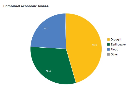 Iz spodnjega grafa (Graf 3) vidimo, da ima Iran največ ekonomske izgube na področju naravnih nesreč, največ zaradi suše (46 %) , sledijo potresi (30%) ter nazadnje poplave (24 %). V Iranu je več kot 2/3 zemlje v sušnem območju, zaloge vode so izredno nizke in stanje se bo v naslednji letih samo še poslabšalo (Iran’s Environment: Greater Threat than Foreign Foes; http://iranprimer.usip.org/blog/2013/oct/28/iran%E2%80%99s-environment-greater-threat-foreign-foes, 18.12.2015). Iz vidika KVM Iran predstavlja visoko tveganje za normalno poslovanje v okolju večjih in težko kategoriziranih naravni nesreč. Poplave so najpogostejše na severnem delu Irana (vključuje zmogljivo provinco Vzhodni Azerbajian, Tehran in Mazandaran, izključena je provinca Esfahan). Potresi zajemajo celotno območje Irana, izključen je samo sušni centralni del (provinca Esfahan). Nazadnje pa so tukaj še vedno hujša obdobja suše, ki se raztezajo po celotnem centralnem delu Irana (izključene vse potencialne province razen province Esfahan). Posledice naravni nesreč se vsekakor odražajo na ekonomskem poslovanju, kjer je kar nekaj groženj, ki vpliva na vsesplošno poslovanje podjetij v Iranu in jih moramo dosledno vključiti v analizo.